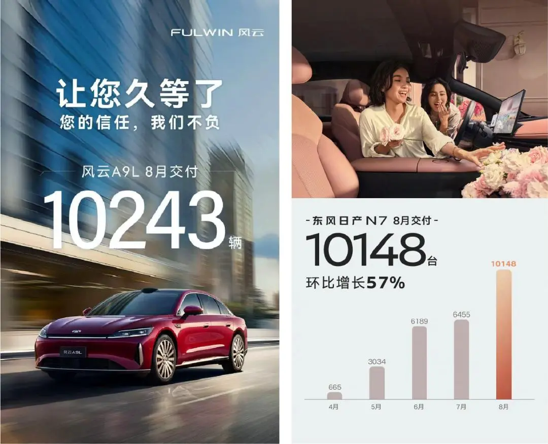东风日产 N7,8 月交付 10148 台,环比增长 57%。这也是首个单月交付破万的合资新能源车。